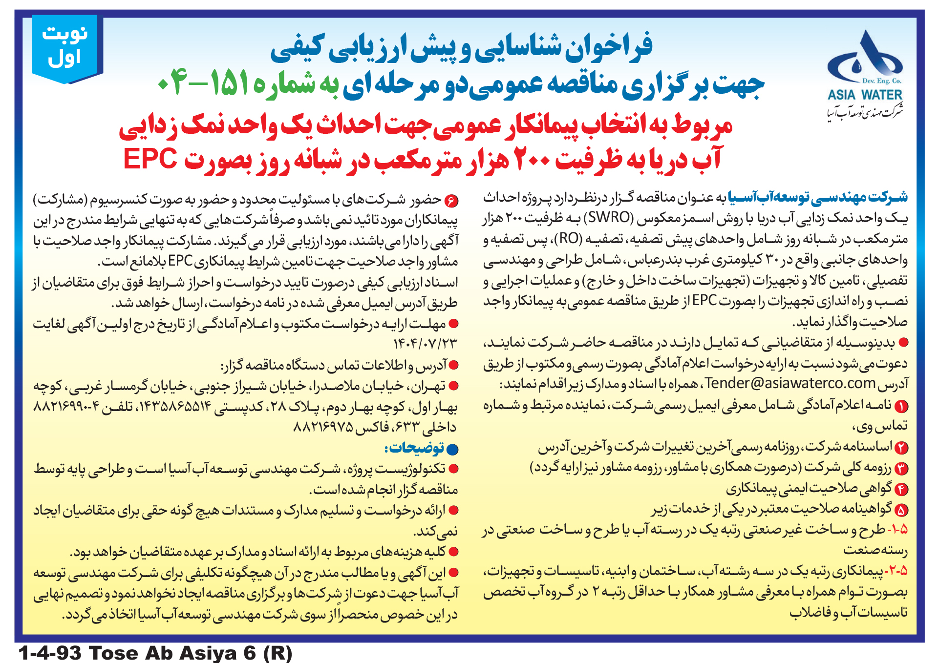 اخبار مناقصات فراخوان شناسایی و پیش ارزیابی کیفی جهت برگزاری مناقصه عمومی دو مرحله ای به شماره 151-04 انتخاب پیمانکار عمومی جهت احداث یک واحد نمک زداییآب دریا به ظرفیت 200 هزار مترمکعب در شبانه روز بصورت EPCادامه متن در تصویر مربوط به مناقصه